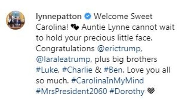 “Chào mừng bé Carolina dễ thương! Dì Lynne thật trông ngóng được nựng nịu gương mặt xinh xắn của cháu. Chúc mừng nhé @erictrump, @laraleatrump, cả các anh trai #Luke, #Charlie & #Ben nữa. Yêu mọi người rất nhiều!”