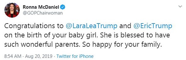 “Chúc mừng @LaraLeaTrump và @EricTrump đã chào đón con gái yêu đến với thế giới này. Con bé thật may mắn khi có bố mẹ như hai người. Chia vui cùng cả nhà nhé”.