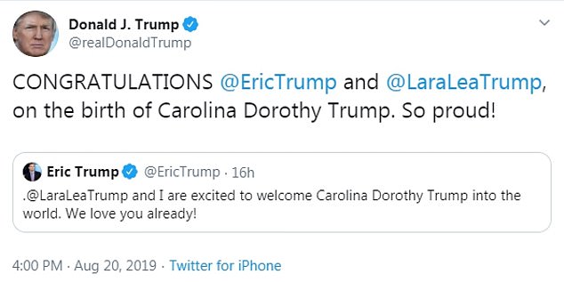 Tổng thống Trump cũng vui mừng trước sự xuất hiện của Carolina. Tổng thống Trump viết trên Twitter cá nhân: “CHÚC MỪNG @EricTrump và @LaraLeaTrump đón chào bé Carolina Dorothy Trump nhé. Bố tự hào quá đi mất!”