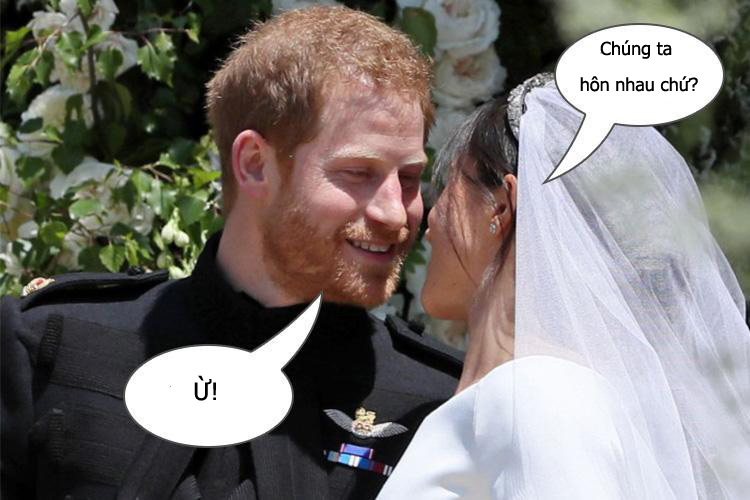 Khi lễ cưới kết thúc, Công tước và nữ Công tước Sussex nắm tay bước ra nhà nguyện. Lúc đứng trên bậc thềm nhà nguyện Thánh George tại lâu đài Windsor, chính Meghan đã chủ động hỏi chồng: “Chúng ta hôn nhau không?“. Đáp trả người vợ xinh đẹp của mình là một tiếng “Ừ” nhẹ nhàng.