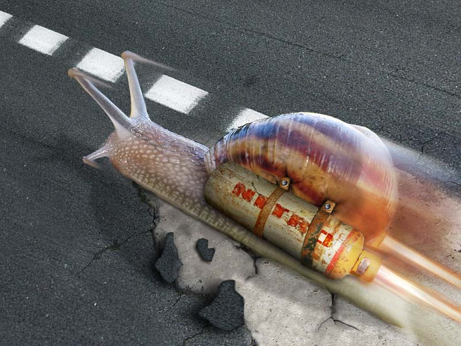 Ốc sên di chuyển rất chậm bởi chúng di chuyển bằng cách co các cơ nhỏ xíu lại và sử dụng như bàn đạp sóng. Để bảo vệ bản thân khỏi những kẻ săn mồi, chúng sử dụng vỏ của mình như một tấm khiên bảo vệ thay vì sử dụng tốc độ để thoát thân. Tuy nhiên, nếu chúng bị săn đuổi hay bị tấn công bởi đồng loại, chúng sẽ “gắn tên lửa” vào “động cơ” để chạy thoát.