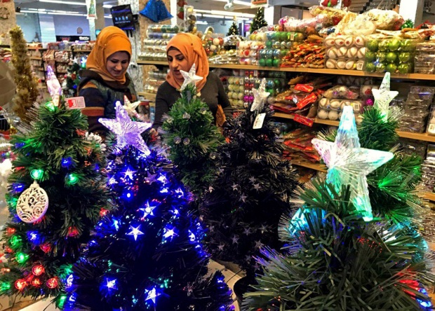 Hai người phụ nữ đi mua đồ trang trí Giáng sinh tại thủ đô Baghdad của Iraq. Dù số lượng người Cơ đốc giáo có giảm ở Baghdad, Giáng sinh vẫn là ngày lễ phổ biến ở đây. Ảnh: AP
