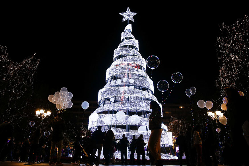 Du khách đổ xô quảng trường Syntagma, thủ đô Athens, Hy Lạp để chiêm ngưỡng cây thông thắp sáng. Ảnh: Reuters