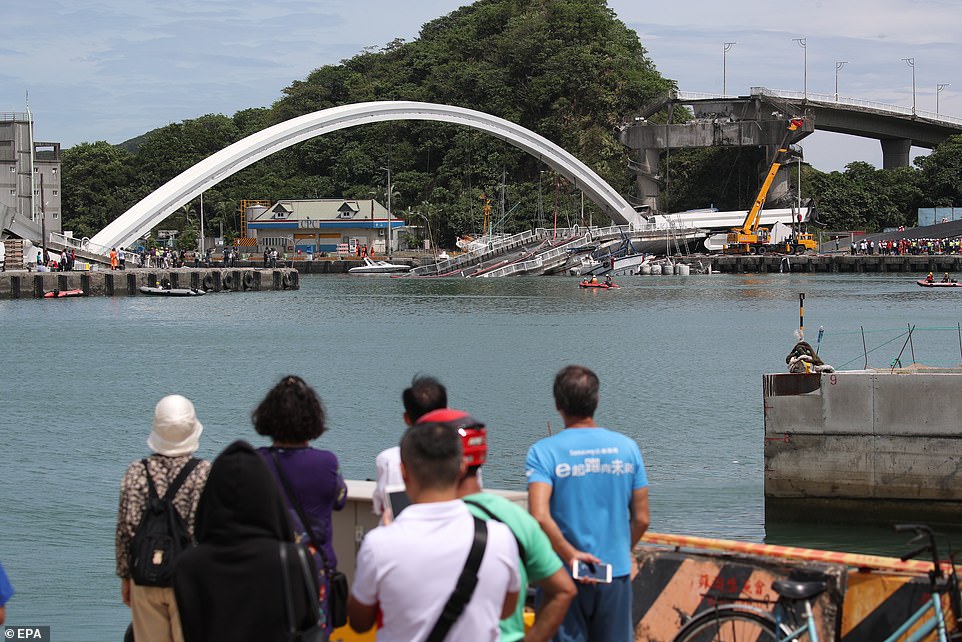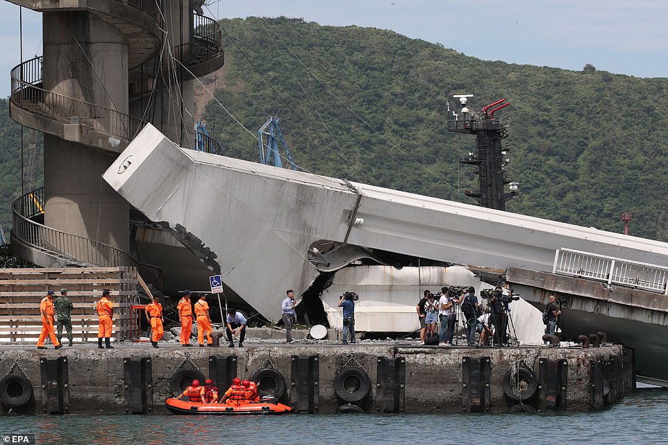Khi các nhân viên cứu hộ làm việc tại hiện trường, cây cầu hoàn toàn chìm trong nước trong khi mái vòm sập xuống vịnh phía đông Đài Loan.