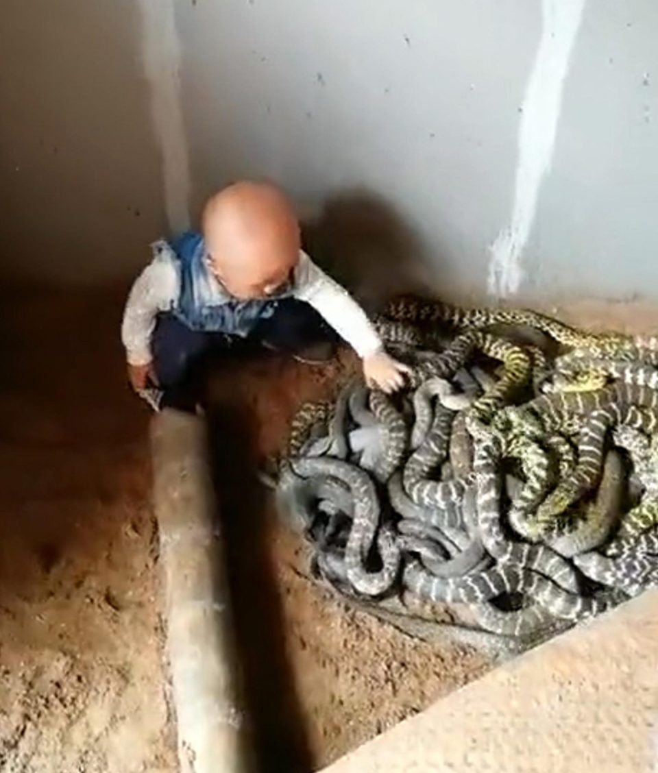 Một đàn rắn đang bò ngang dọc được nhìn thấy sau khi cha của cậu bé nâng tấm thảm lên. Người đàn ông này mải mê quay phim và còn cổ vũ con trai đùa nghịch với loài bò sát. Dường như anh ta không lo ngại rằng những con rắn có thể cắn cậu bé.