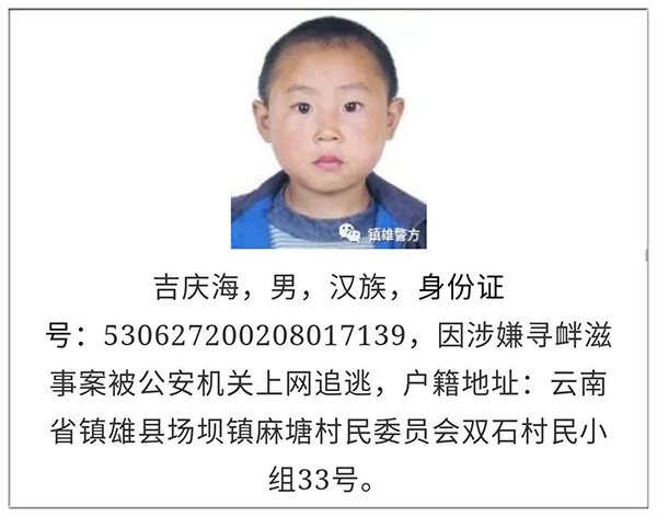 'Văn phòng Cảnh sát huyện Trấn Hùng hôm 19/3 đăng thông báo truy nã Ji Qinghai, một tên tội phạm nguy hiểm đang lẩn trốn suốt thời gian dài, trên trang web của cơ quan này. Bức ảnh truy nã là Ji Qinghai với khuôn mặt bụ bẫm thời còn đi học mẫu giáo khiến mọi người khó hiểu. Nghi phạm hiện 17 tuổi.