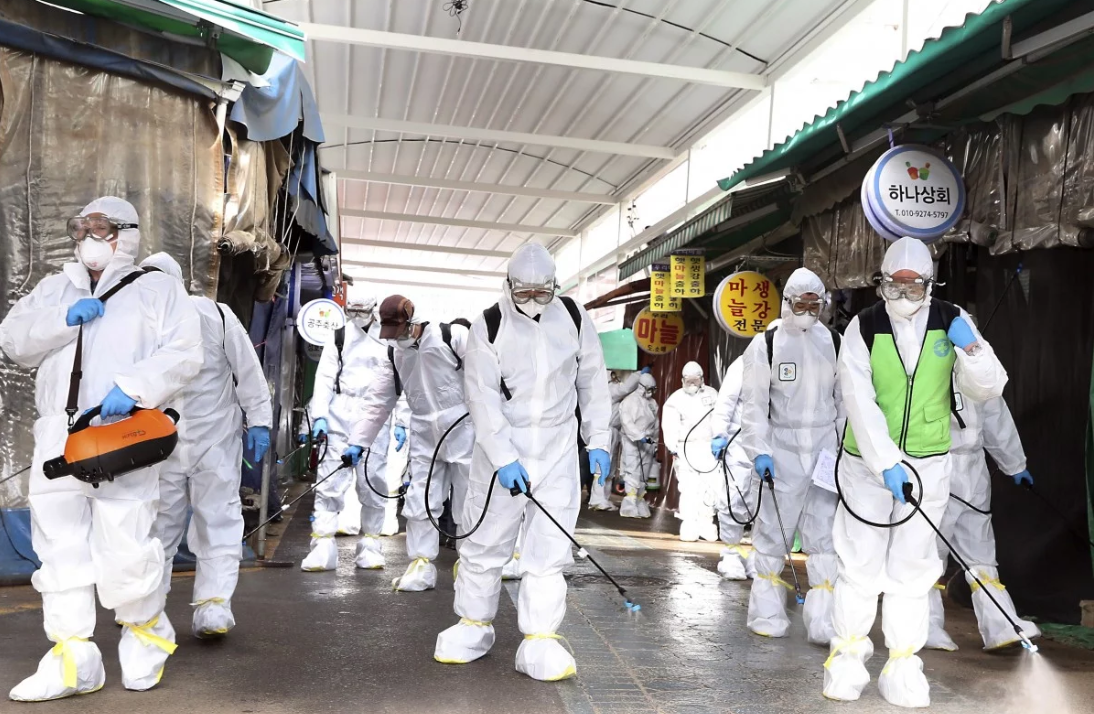 Nhân viên y tế phun thuốc khử trùng tại một khu chợ ở Bupyeong, Hàn Quốc. Ảnh: AP