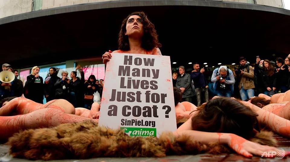 Các nhà hoạt động vì quyền động vật đã khỏa thân và “tắm” trong máu giả, nằm bất động ngay giữa quảng trường Plaza Catalunya, một trong những điểm mua sắm và du lịch chính của thành phố Barcelona, nơi đông người qua lại và vô cùng náo nhiệt. Chưa hết, để mọi người hiểu rõ hơn về mục đích của hành động này, họ còn đặt bên cạnh những tấm bảng khẩu hiệu có dòng chữ: “Cần bao nhiêu sinh mạng để làm nên một chiếc khoác?”.