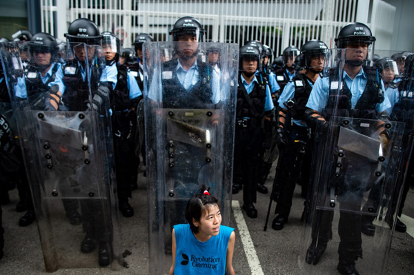 Một người biểu tình ngồi ngay trước hàng rào cảnh sát bên ngoài trụ sở cơ quan lập pháp sáng nay. Trước đó, hôm 9/6, theo những người tổ chức biểu tình, hơn một triệu người đã đổ xuống đường phản đối dự luật dẫn độ, dù cảnh sát ước tính có 240.000 đã tham gia xuống đường ở thời điểm cao trào nhất và chính quyền đã phải huy động hơn 2.000 cảnh sát ứng phó với cuộc biểu tình. Ảnh: AFP