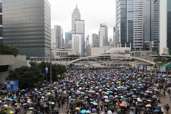 Người biểu tình đội mưa vây kín các con đường dẫn tới trụ sở cơ quan lập pháp Hong Kong. Một loạt các nhóm dân sự đã lên tiếng chống lại dự luật dẫn độ sang Trung Quốc trong những ngày gần đây bao gồm nhiều trường học, luật sư và doanh nghiệp, với hàng trăm kiến nghị được lập ra. Hơn 100 doanh nghiệp bao gồm một tạp chí cho biết họ sẽ đóng cửa để cho phép nhân viên xuống đường biểu tình và gần 4.000 giáo viên cho biết họ sẽ đình công. Một số công ty tài chính, bao gồm HSBC, đã sắp xếp công việc linh hoạt cho nhân viên trong ngày hôm nay. Ảnh: SCMP