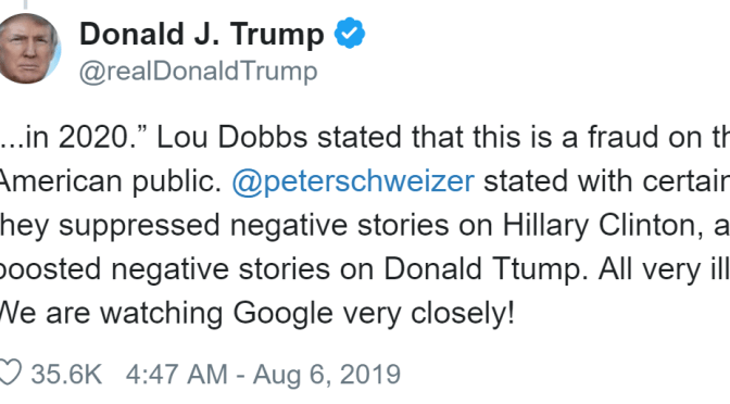 Trump viết: “Lou Dobbs tuyên bố hành vi này đã lừa dối công chúng nước Mỹ. Peter Schweizer khẳng định những công ty đó đã ém nhẹm nhiều vụ bê bối kinh khủng của Hillary Clinton và chỉ lăm le nhắm vào Donald Ttump. Đây là hành động vi phạm pháp luật. Chúng tôi đang theo dõi Google hết sức gắt gao!”