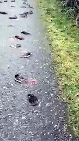 Qua ống kính trên điện thoại của Edwards, hàng dài sáo đá nằm trong vũng máu, phía sau hàng rào ngăn cách vệ đường với con đường chính cũng đầy xác chim sáo, cảnh tượng vô cùng thảm thiết. Edwards cho biết: “Số lượng sáo đá tử vong có khi phải đến 300 con, đếm đến mọt nửa thì tôi phải bỏ cuộc vì chúng đông quá, xác chết chồng lên nhau. Cảm giác như chúng đột ngột rơi từ trên trời xuống vậy”.