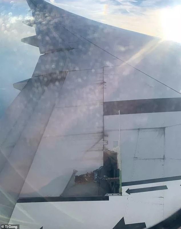 Lỗ thủng hình chữ L trên cánh máy bay, lớp vỏ đã bị cuốn phăng đi trong lúc phi công tăng tốc.