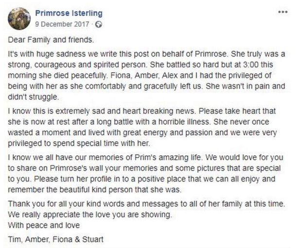 “Prim biết rằng dù cho bệnh tật thế nào thì cô ấy vẫn muốn sống hết mình và cố gắng có càng nhiều phiêu lưu trải nghiệm và niềm vui càng tốt”.