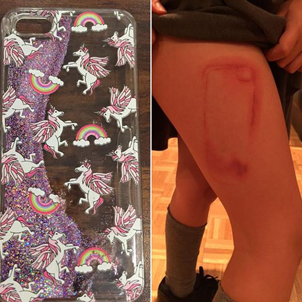 Cụ thể, có một trường hợp bé gái 9 tuổi ở Anh Quốc sử dụng loại case iPhone trong suốt, có dung dịch và kim tuyến bên trong để trang trí, chiếc case này đã bục ra khi cô bé đang ngủ. Dung dịch đó trào khỏi điện thoại và dây vào đùi, tạo thành một vết bỏng in hình điện thoại. Hiện vết bỏng này đã thành sẹo vĩnh viễn trên đùi cô bé. Chiếc ốp lưng này được mua với giá khoảng 6 Bảng Anh ở cửa hàng địa phương, nhiều người cho rằng nó có xuất xứ từ Trung Quốc.