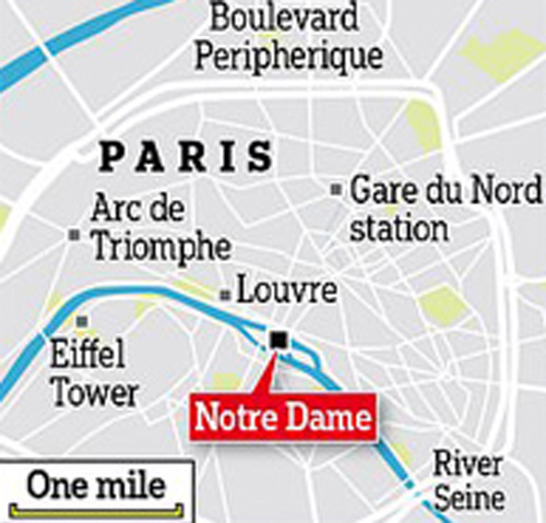 Vị trí nhà thờ Đức Bà (màu đỏ) ở thủ đô Paris.