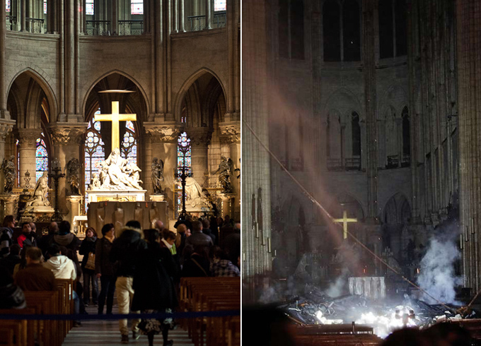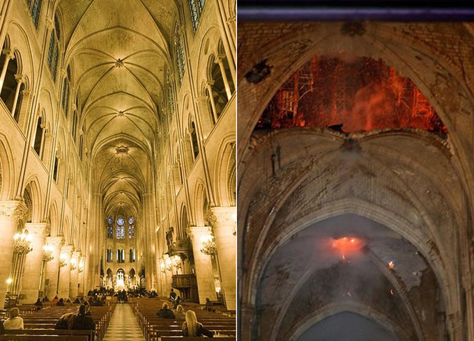Đám cháy gần như thiêu rụi phần mái vòm, làm đổ sập tháp chuông chính. Trong ảnh, phần mái vòm bằng đá cao hàng chục mét trước khi bị cháy (trái) và bị phá hủy một phần sau hỏa hoạn (phải).