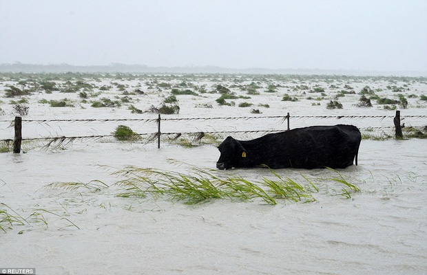Một chú bò cũng bị kẹt trong dòng nước lũ tại Fulton, Texas.