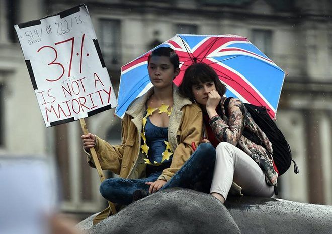 Những người biểu tình ở quảng trường Trafalgar, trung tâm London giơ các biểu ngữ, thể hiện tinh thần đoàn kết với EU. Sau khi có kết quả cuộc trưng cầu dân ý ở Anh, rất nhiều người Anh, đặc biệt là người trẻ bày tỏ nguyện vọng muốn nước Anh ở lại chứ không phải ra đi.