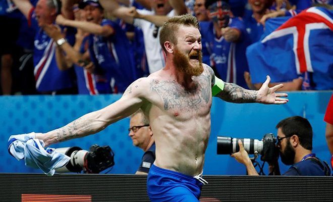 Đội trưởng tuyển Iceland Aron Gunnarsson ăn mừng sau khi thắng Anh 2-1, giành vé vào vòng tứ kết Euro 2016. Đội tuyển Iceland được xem như là một hiện tượng tại Euro năm nay với những màn trình diễn ấn tượng và thuyết phục.