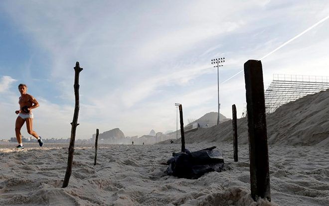 Người đàn ông chạy bộ gần một mảnh thi thể được tìm thấy trên bãi biển Copacabana hôm 29/6, ngay cạnh khu vực thi đấu môn bóng chuyền bãi biển của Olympics năm nay. Thế vận hội mùa hè được tổ chức ở thành phố Rio de Janeiro, Brazil.