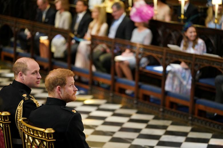 Hoàng tử William ngồi cạnh Hoàng tử Harry trong lúc chờ cô dâu Meghan tới lễ đường. Ảnh: Reuters