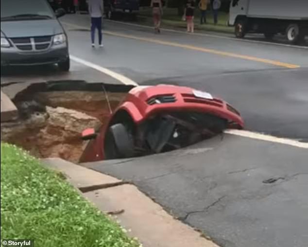 Video do tài khoản Oscar Galdamez đăng trên mạng Facebook ghi lại video cho thấy sự việc xảy ra ở thành phố Dale, bang Virginia tối 4/7 tuần trước. Cả chiếc xe van màu đỏ hiệu Dodge Caravan gần như rơi lọt xuống hố lớn, chỉ còn một chút phần đầu xe còn ở trên mặt đất.