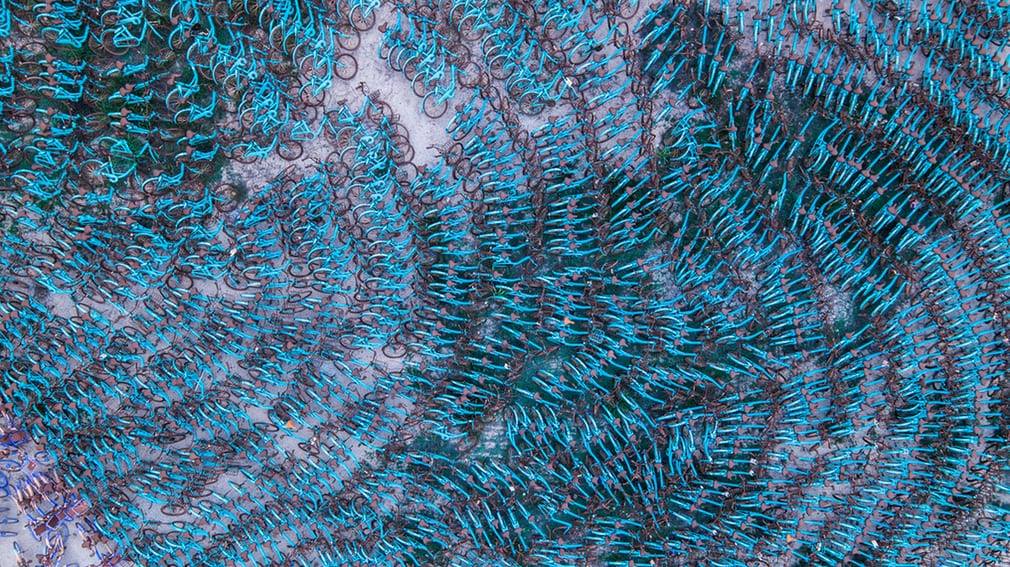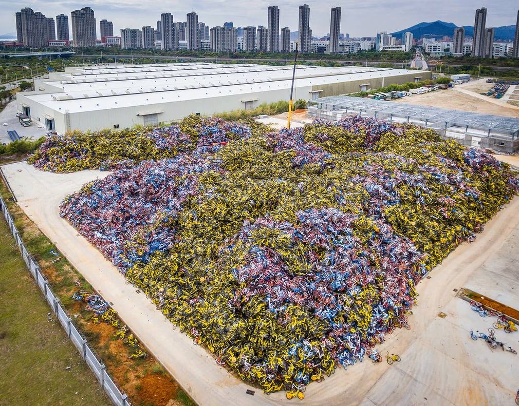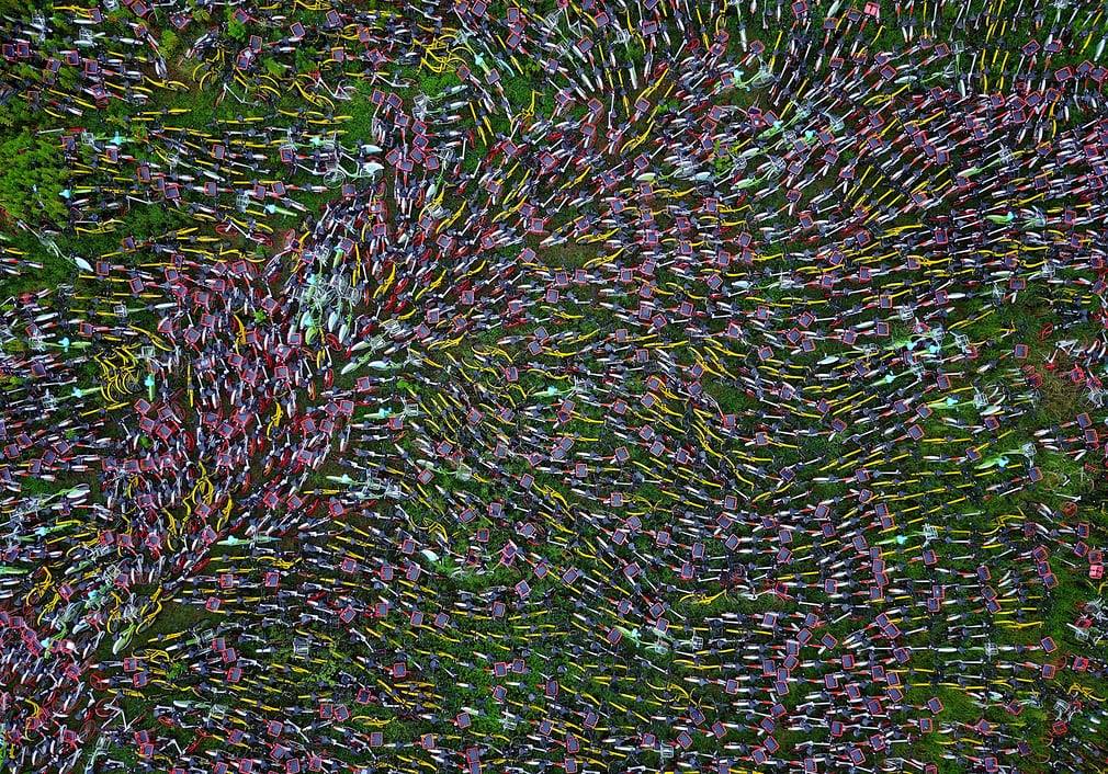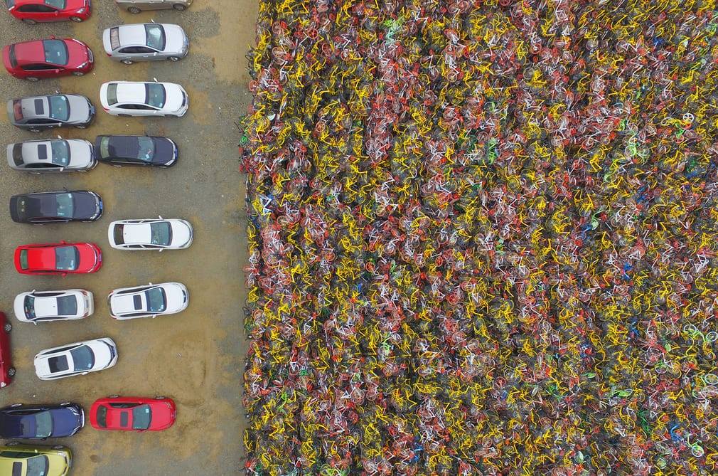 Hình ảnh chụp từ trên bao một nghĩa địa xe đạp ở Lư Dương, thành phố Hợp Phì, tỉnh An Huy. Số xe đạp cho thuê này bị cơ quan quản lý đô thị của chính quyền địa phương thu giữ. Xe đạp cho thuê từng rất phổ biến ở Trung Quốc, tuy nhiên tình trạng cung vượt quá cầu, cùng với ý thức kém của người dùng, đang khiến các bãi phế thải xe đạp ngày càng nhiều hơn. Đa số những chiếc xe này bị đâm hỏng, phá hoại, mất cắp phụ tùng hoặc vứt bừa bãi.