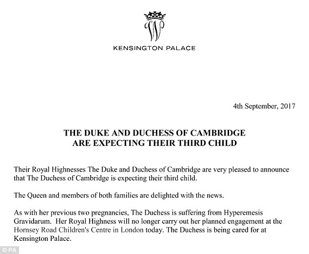 Theo thông cáo: “Cũng như hai lần mang thai trước, nữ Công tước đã bị ốm nghén nặng. Cô sẽ không tiếp tục thực hiện các kế hoạch tại Trung tâm trẻ em Hornsey Road ở London trong ngày hôm nay. Hiện nữ Công tước đang được chăm sóc tại điện Kensington.”