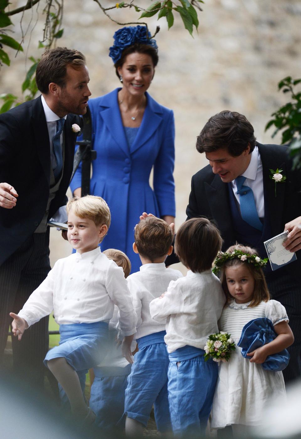 George đã chạy vòng quanh cùng dàn phù rể nhí với tâm thế giống như thủ lĩnh và thỉnh thoảng lại cười khúc khích khi bắt chước động tác của kỵ binh. Ảnh: The Sun