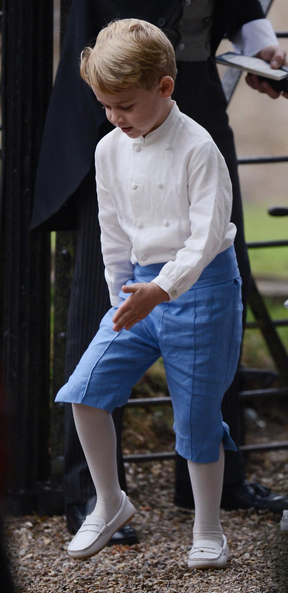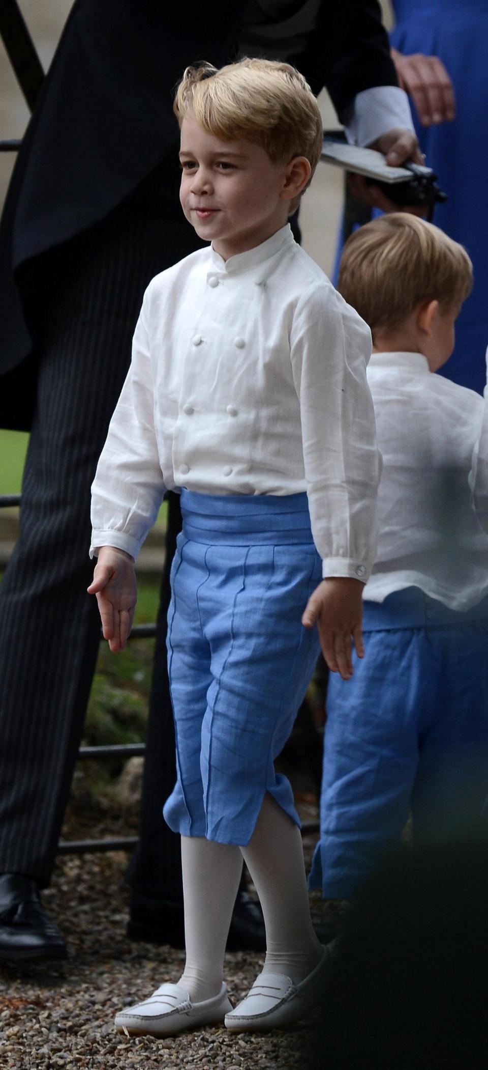 Dù mặc đồng phục áo trắng quần xanh nhưng Hoàng tử George vẫn vô cùng đáng yêu và nổi bật trong dàn phù rể nhí. Ảnh: The Sun
