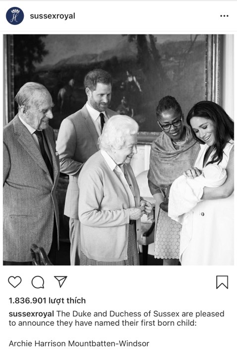 “Công tước và Nữ công tước xứ Sussex vui mừng thông báo họ đã đặt tên cho đứa con đầu lòng của họ là Archie Harrison Mountbatten-Windsor”, tài khoản Instagram của cặp đôi hoàng gia @sussexroyal cho hay, đăng kèm với một bức ảnh Hoàng tử Harry, Meghan, em bé, Nữ hoàng Elizabeth và Hoàng tế Philip.