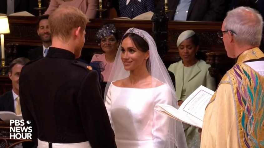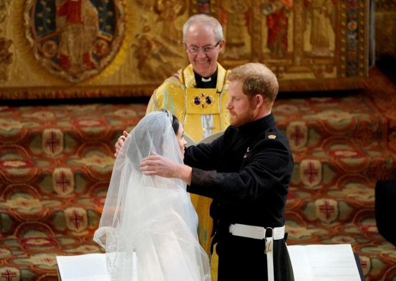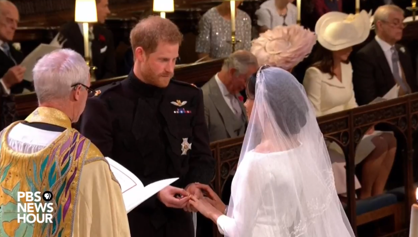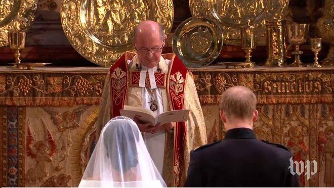 Hoàng tử Harry trao nhẫn cho Meghan. Giám mục Canterbury chủ trì lễ đọc lời thề nguyện. Sau khi Harry và Meghan đọc lời thề, Giám mục Canterbury nói: “Ta tuyên bố hai con là vợ chồng”.