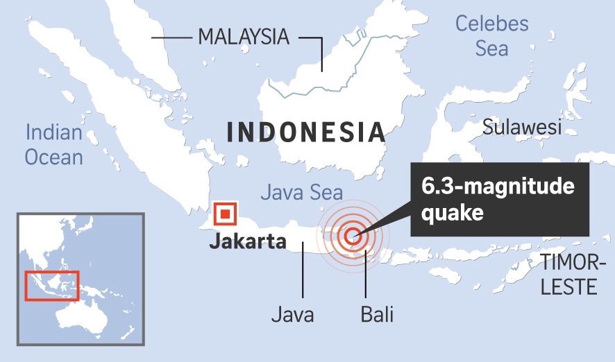 Động đất mạnh 6,3 độ Richter sáng nay xảy ra ngoài khơi đảo Java và Bali của Indonesia.