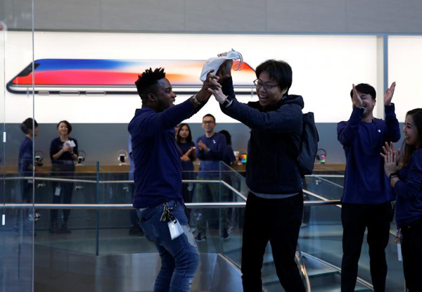 Nhân viên Apple chào đón khách hàng đầu tiên tới mua iphone X ở khu mua sắm Omotesando, Tokyo, Nhật Bản.