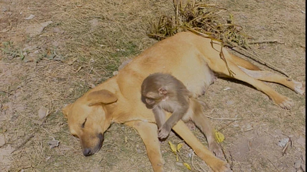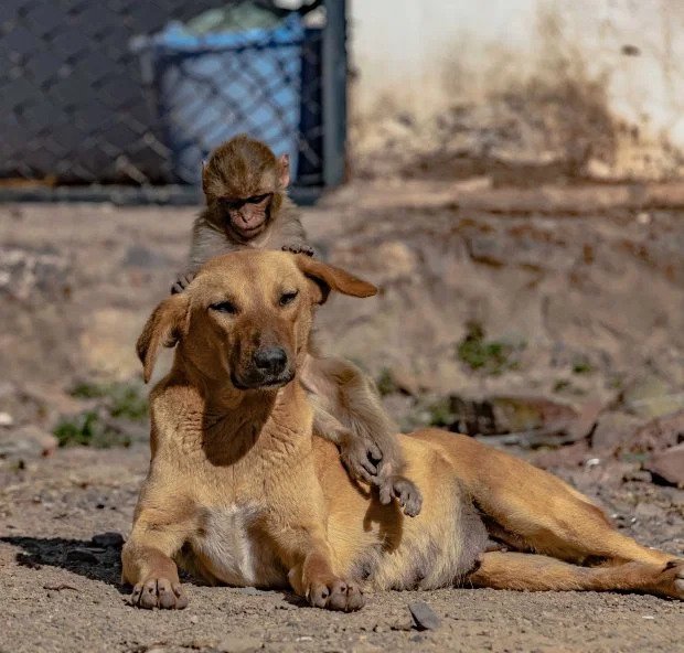 Chú chó có lẽ đã nhận nuôi khỉ con tội nghiệp sau khi mẹ của nó bị một số người dân địa phương đầu độc vì tội phá hủy mùa màng. Prakash Badal, 48 tuổi, nhiếp ảnh gia chụp lại những bức ảnh của khỉ con và mẹ chó tại một ngôi làng gần bang Himachal Pradesh ở Ấn Độ, cho biết: