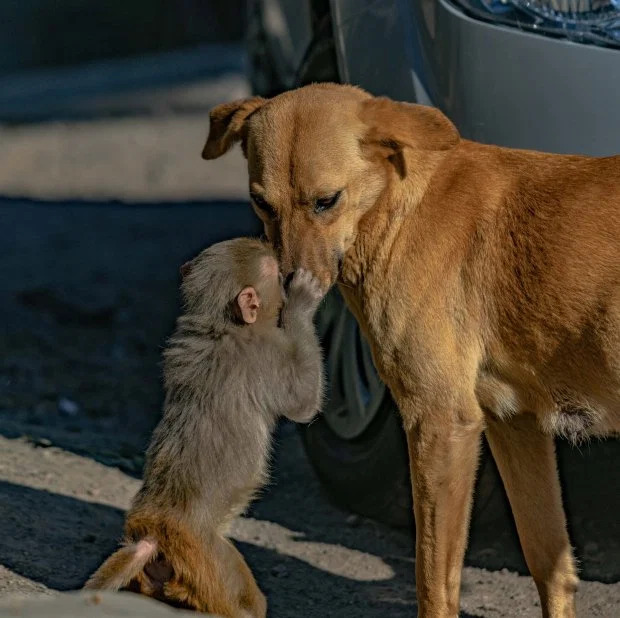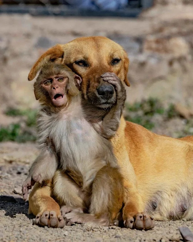 Bản năng làm mẹ đã khiến chú chó chủ động nuôi dưỡng khỉ con ngay cả khi nó từ một loài khác.