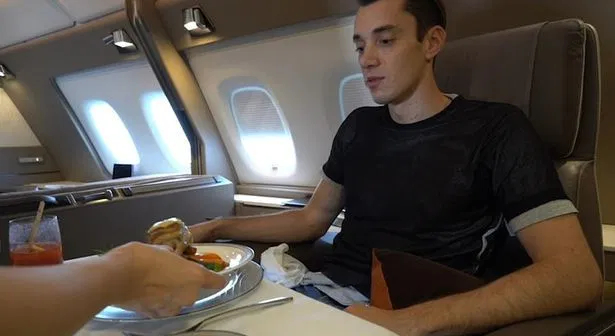 Jean ngồi ở ghế 1A, một trong bốn cabin trên máy bay có thể mở ra để tăng gấp đôi diện tích bên trong, đồng thời biến giường đơn thành giường đôi rộng rãi. Suốt chuyến bay dài, anh luôn miệng khen món trứng cá muối thượng hạng phối hợp hoàn hảo cùng các loại rượu như Dom Perignon và Krug Champagne.