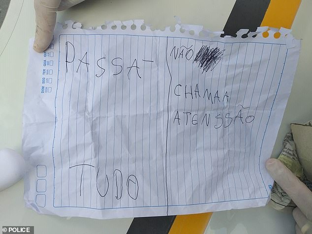 Ghi chú từ nghi phạm, người mà chính quyền cho biết bị bại não và không thể cử động tay, có viết: “Giao nộp tất cả ra đây. Đừng gây sự chú ý”.