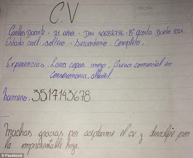 Bản CV viết tay của Carlos Duarte. Ảnh: Daily Mail