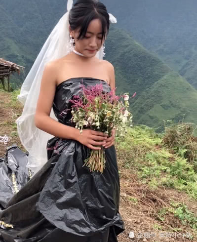 Thế nhưng, nhiều cặp đôi do hoàn cảnh gia đình không cho phép, họ chỉ đành chọn một bộ lễ phục thật đơn giản, thậm chí phải tự thiết tay thiết kế chiếc váy cưới của mình từ những liệu sẵn có để tiết kiệm chi phí. Chẳng hạn như cô dâu người Trung Quốc này đã mặc một chiếc váy cưới màu đen được làm từ túi đựng rác trong ngày trọng đại của đời mình.