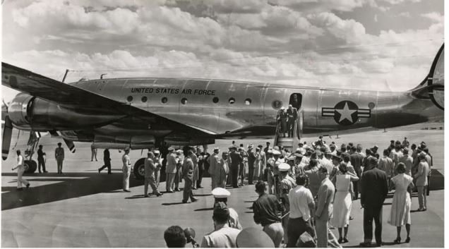 Tổng thống Dwight Eisenhower cùng đệ nhất Phu nhân Mamie Eisenhower bước ra từ chiếc Columbine II, năm 1953. Ảnh: City of Marana
