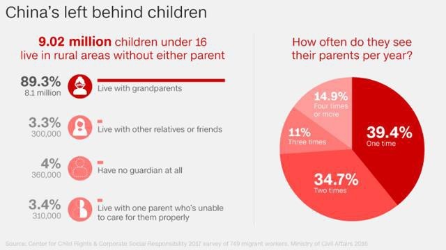 Theo số liệu chính thức năm 2016, có 9,02 triệu trẻ em dưới 16 tuổi ở nông thôn Trung Quốc bị bố mẹ bỏ lại sống với người thân để đi làm xa. Trước đó, một kết quả thống kê năm 2010 cũng cho thấy hơn 60 triệu trẻ em dưới 18 tuổi sống thiếu cha hoặc mẹ, hoặc cả hai.