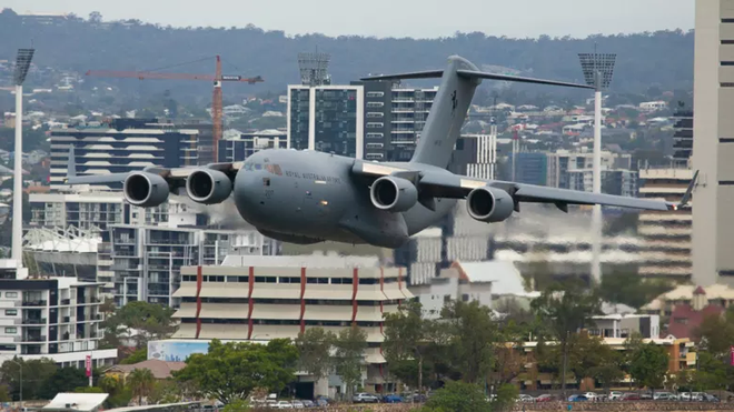 Vào cuối tuần vừa rồi, cư dân thành phố Brisbane, bang Queensland, Úc đã có dịp chứng kiến chiếc Boeing C-17 bay tầm thấp ngay trong lòng thành phố. Đó là thời điểm máy bay vận tải quân sự của Không quân Hoàng gia Úc lướt qua thành phố ở độ cao 100 m, tức còn thấp hơn cả một số tòa nhà cao tầng.