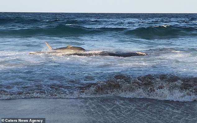 Con cá mập bị mắc kẹt giữa bờ biển và xác cá voi lưng gù.