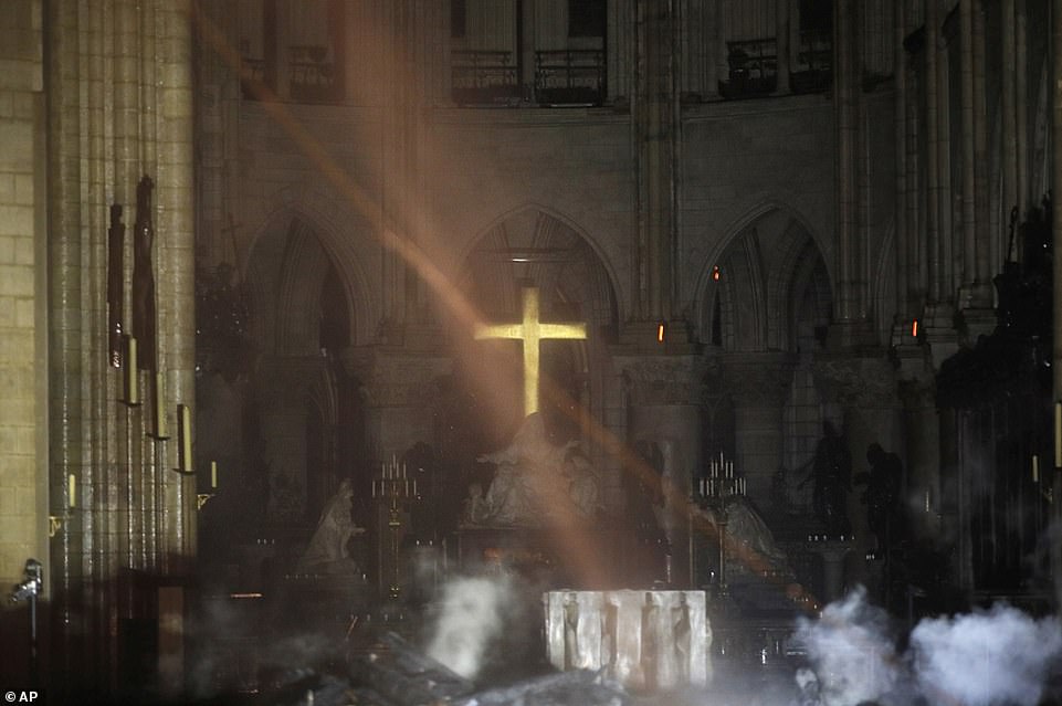 Bằng cách nào đó, cây thánh giá nằm trên bệ thờ vẫn đứng sừng sững bất chấp lửa cháy dữ dội. Thị trưởng Paris Anne Hidalgo nói với Le Monde rằng có một lỗ thủg lớn trên mái nhà. “Bệ thờ và cây thánh giá vẫn nguyên vẹn. Cảnh tượng không tệ như tôi lo sợ”, bà thị trưởng nói.