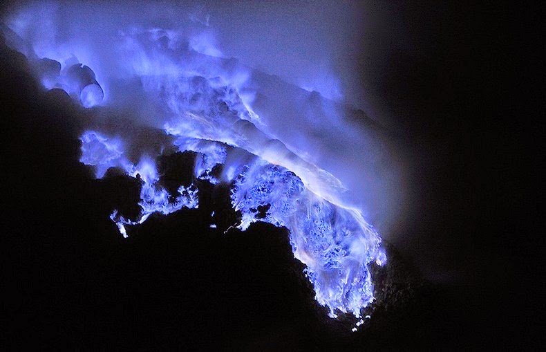 Kwan Ijen là một trong số nhiều ngọn núi lửa vẫn đang hoạt động tại phía Đông đảo Java, Indonesia. Khi màn đêm buông xuống, ngọn núi không ngừng phát ra ánh sáng màu xanh ngọc huyền ảo, tạo nên một vẻ đẹp có một-không-hai . Dưới tác động của áp suất và nhiệt độ cao đến 600 độ C, từ các khe nứt trên ngọn núi sẽ xuất hiện khí gas. Khi tiếp xúc với không khí, các khí gas này sẽ bốc cháy và phát ra những đốm lửa có chiều dài đến gần 5 mét. Trong khi đó, một số khí gas ngưng tụ thành lưu huỳnh dạng lỏng, chảy xuống dốc núi như những dòng nham thạch xanh .