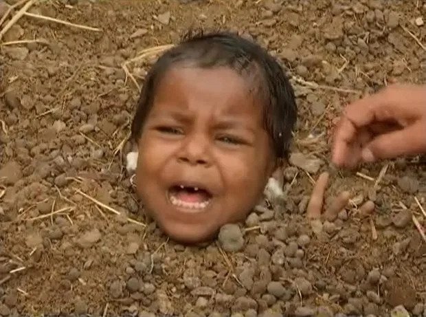 Trong một đoạn video kỳ lạ từ Ấn Độ, những đứa trẻ đang hết sức hoảng sợ vì bị chôn cả thân mình xuống đất hôi thối, chỉ chừa lại mỗi khuôn mặt ngoi lên mặt đất. Được biết, đây là một hủ tục tại ngôi làng Taj-Sultanpur của Ấn Độ, khi những bậc cha mẹ mê tín đã chôn con cái họ trong sự kiện nhật thực hiếm hoi với niềm tin rằng có thể chữa bệnh cho con bằng cách này.
