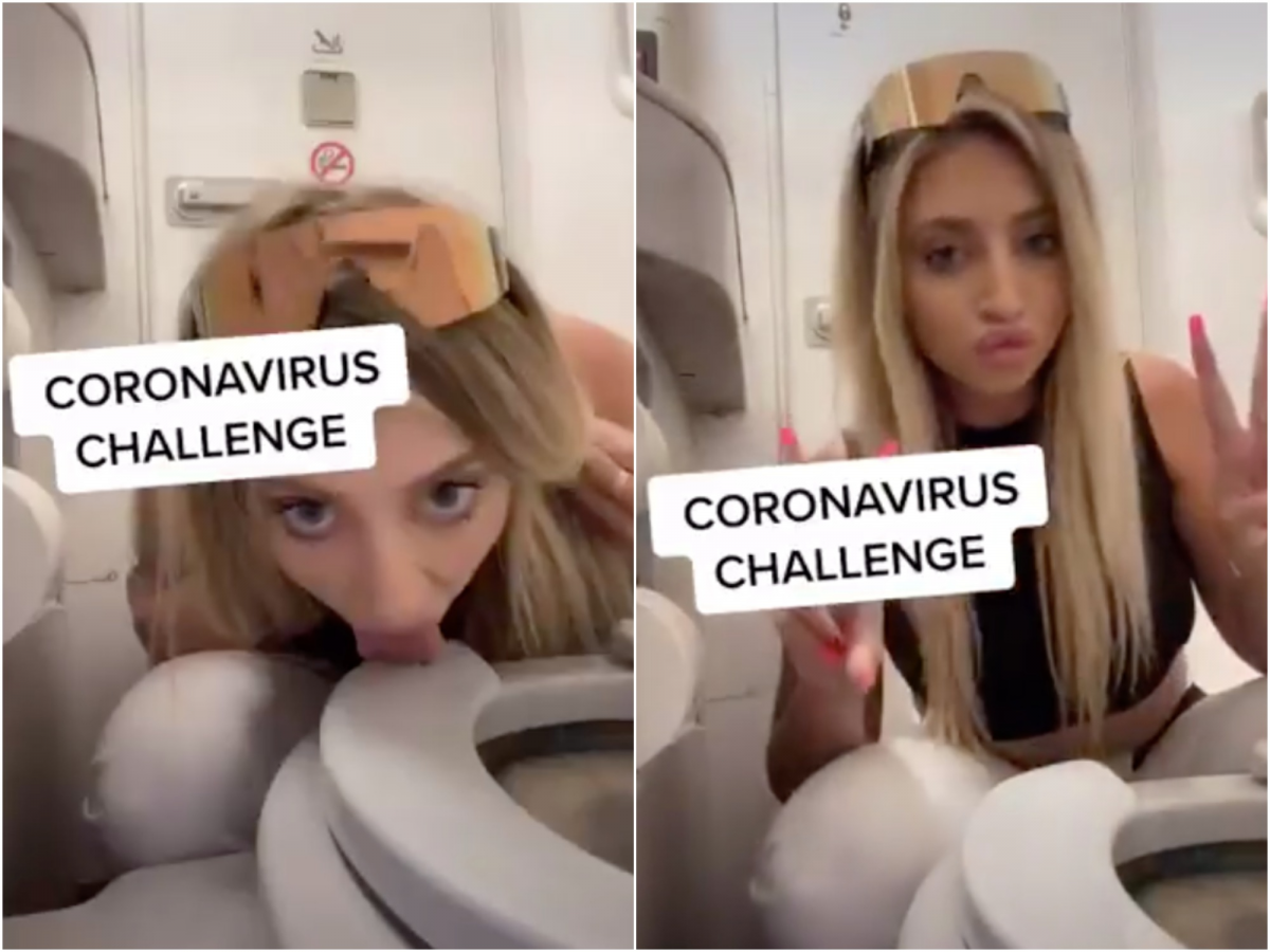 Gần đây, một cô gái 22 tuổi ở thành phố Miami, bang Florida, Mỹ, người có nhiều lượt theo dõi trên mạng xã hội đã bắt đầu “thử thách virus corona” bằng cách đăng tải một đoạn video dài 6 giây quay cảnh cô ta liếm bồn cầu trên máy bay. Đoạn video sau khi được đăng tải đã gây ra một làn sóng phẫn nộ trên mạng xã hội, thậm chí nhiều cư dân mạng cũng cho rằng nên bắt giam cô gái này vì hành động đó. Trang mạng xã hội của cô gái cũng bị đánh sập sau khi đăng tải đoạn video kia.