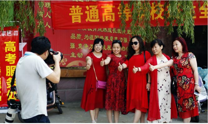Các bậc phụ huynh của các thí sinh cùng tạo dáng chụp ảnh tại trường thi Hành Thủy, tại tỉnh Hà Bắc, Trung Quốc.